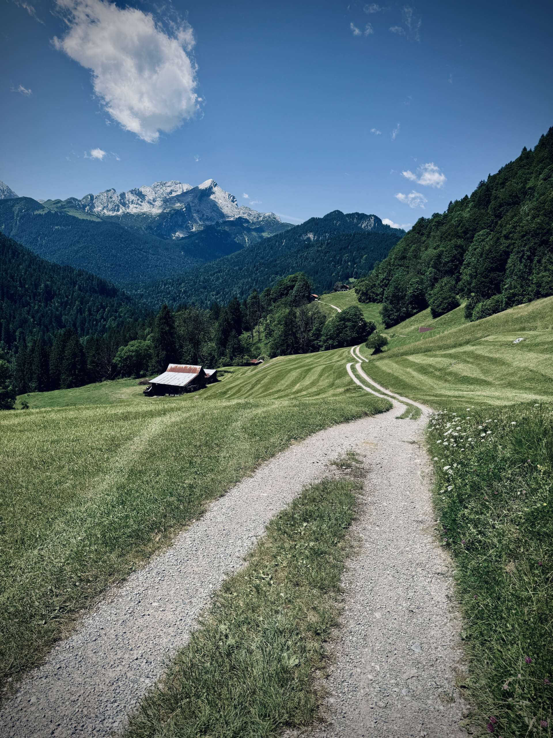 Die Tour startet in unmittelbarer Nähe von Garmisch-Partenkirchen und führt schnell hinaus in eine beeindruckende Naturkulisse. Schon zu Beginn öffnen sich weite Blicke auf das Wettersteinmassiv, bevor die ersten ruhigen Abschnitte erreicht werden.