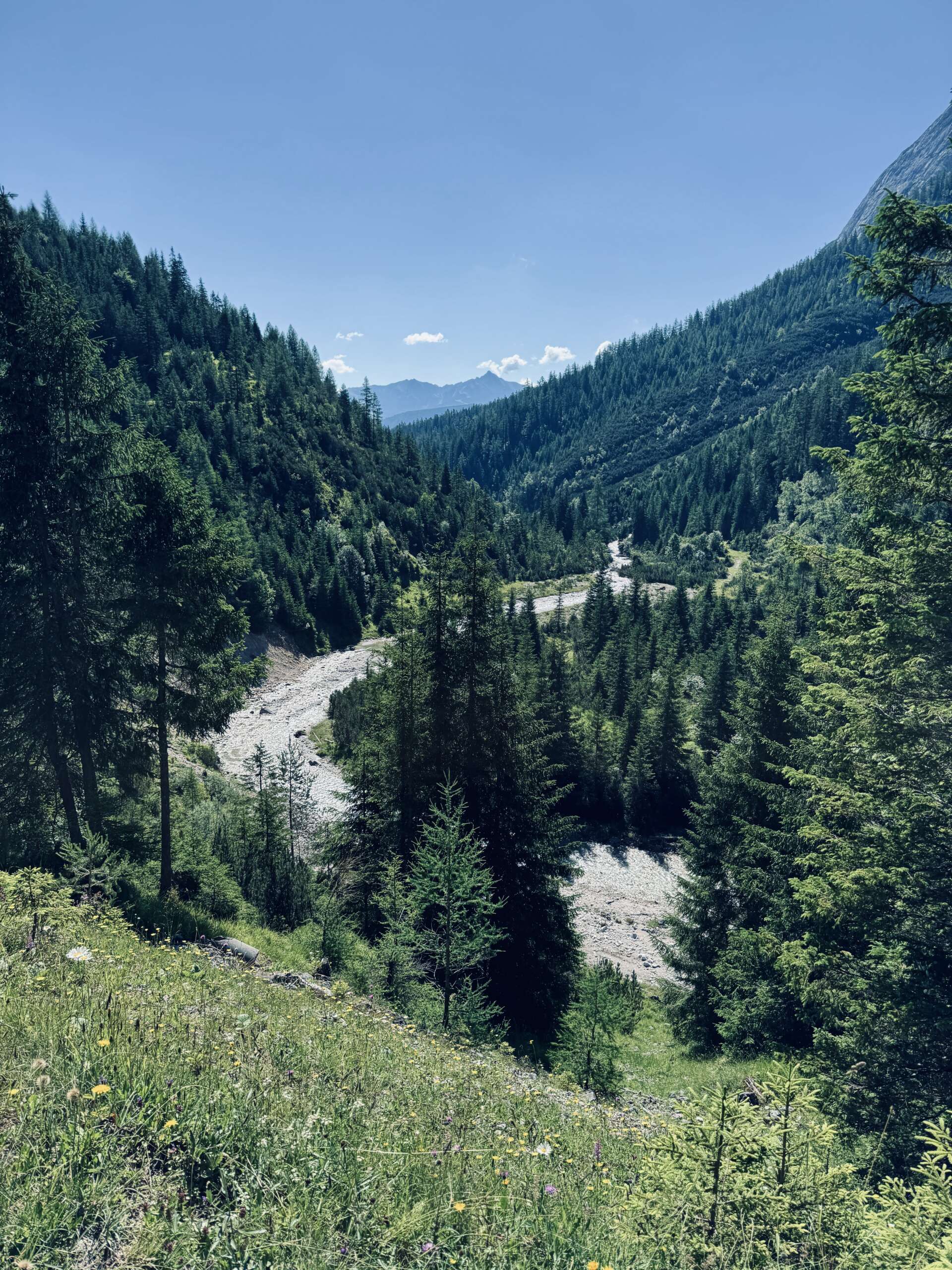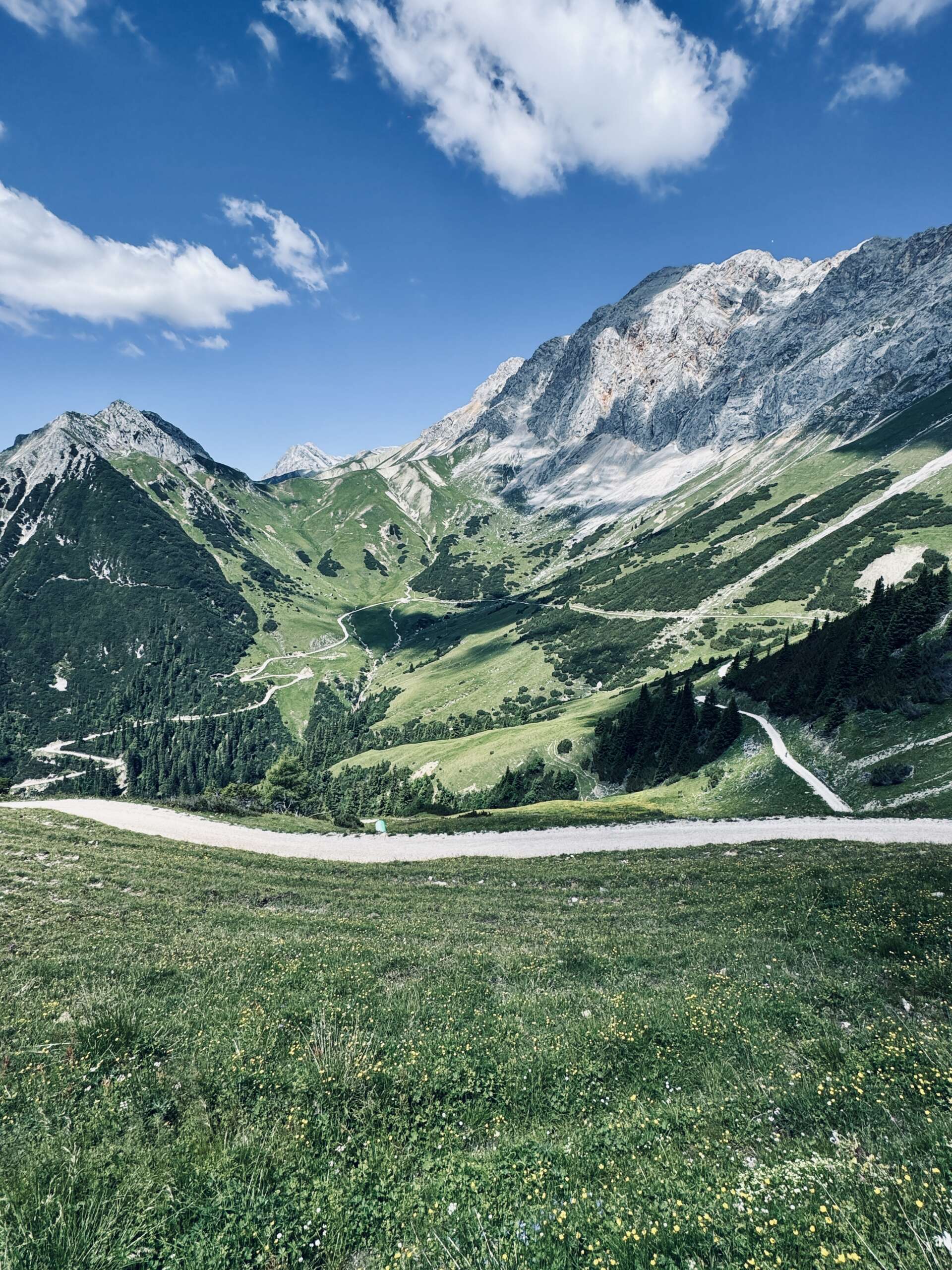 Der Startpunkt liegt in Leutasch. Von hier führt die Route zunächst entspannt entlang der Leutascher Ache hinein ins weitläufige Gaistal. Der Einstieg ist ruhig und ideal, um in den Rhythmus zu kommen. Wiesen, Wasserläufe und die umliegenden Berge sorgen bereits auf den ersten Kilometern für echtes Alpenfeeling.