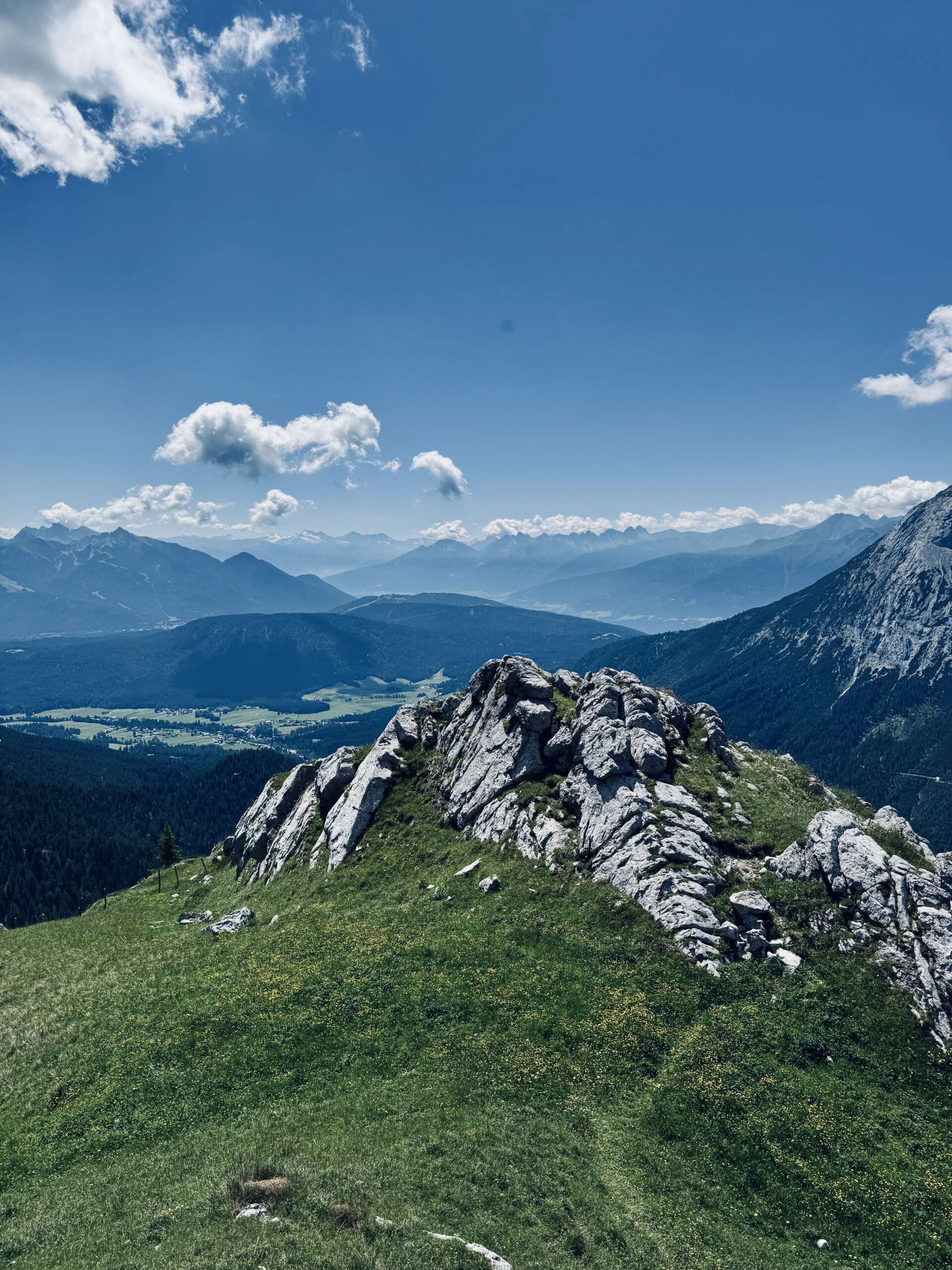 Die Rotmoosalm liegt unterhalb des Schönberggipfels auf 2.030 Metern und ist das klare Highlight der Tour. Der Blick reicht über mehrere Gebirgsketten, das Gaistal liegt tief unter einem und die Mühen des Anstiegs sind schnell vergessen. Eine Einkehr hier oben gehört unbedingt dazu.